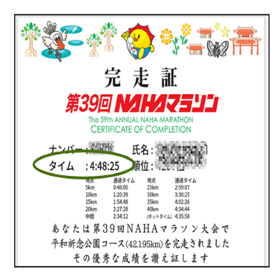 NAHAマラソンで、4年越しの目標であった「サブ5」を達成したのです。